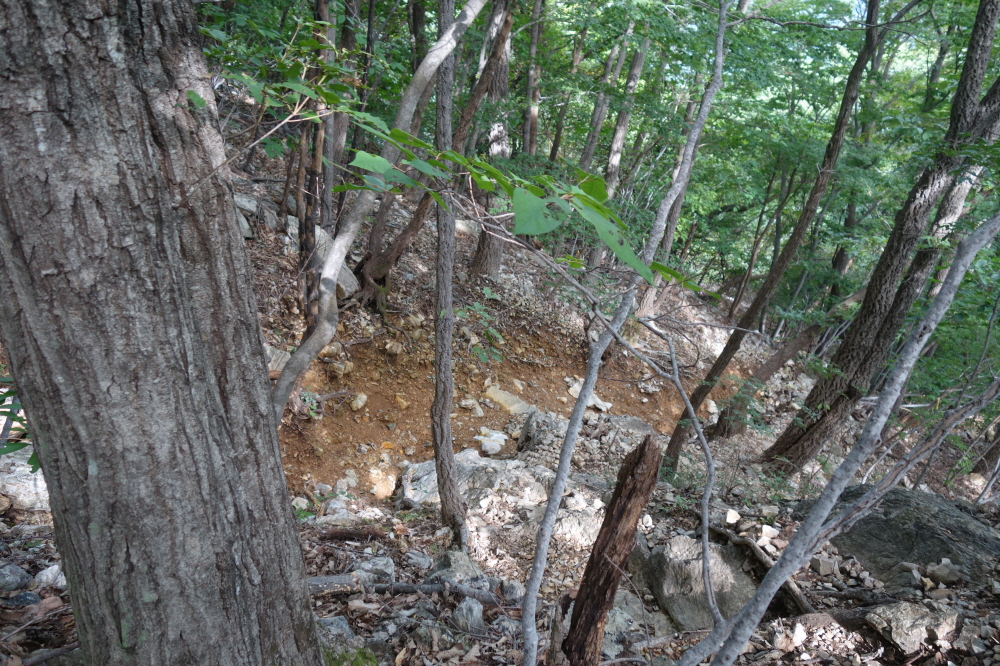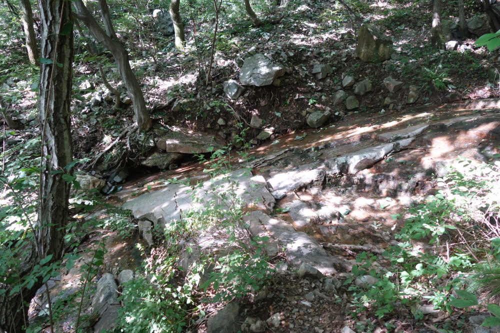 천질바위에서 임도에 내려서기 까지는 급경사 자갈길이어서 장딴지에 힘이 많이 들어간다.