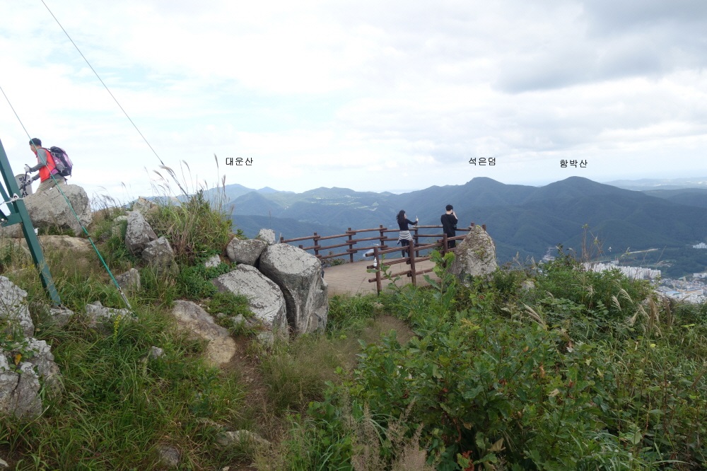 좌측 멀리 대운산이 있고 우측으로 석은덤봉과 함박산이 보인다