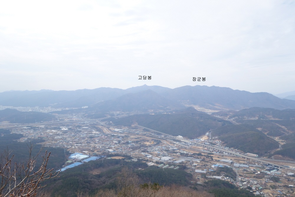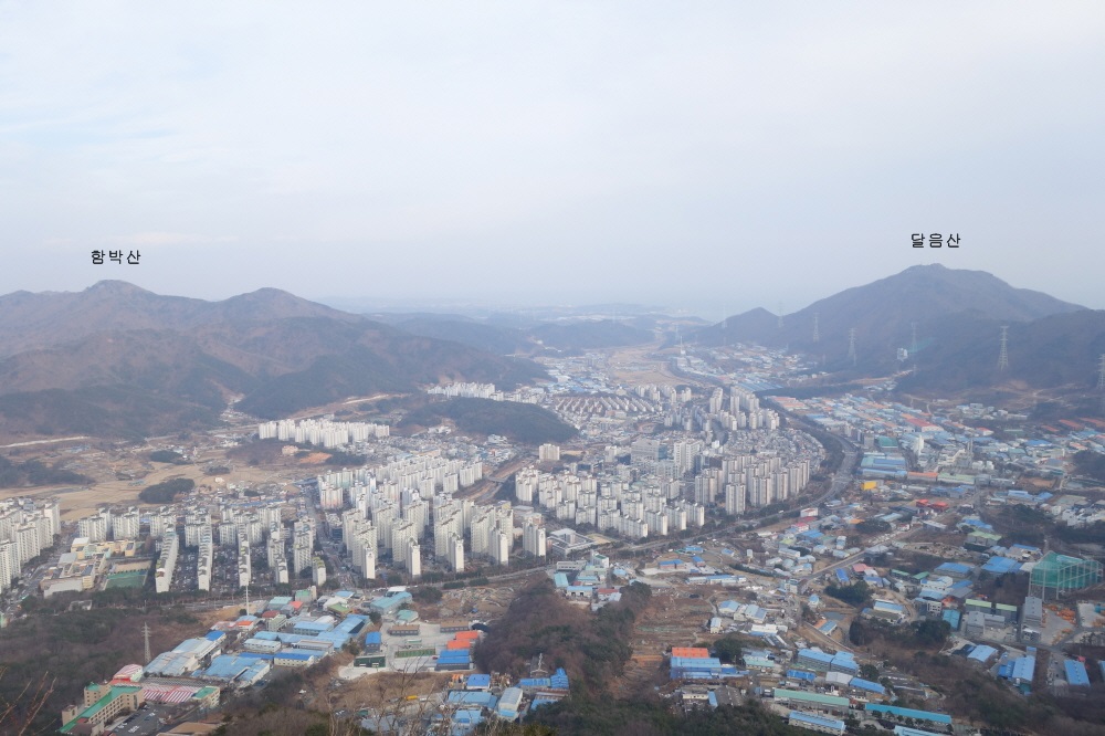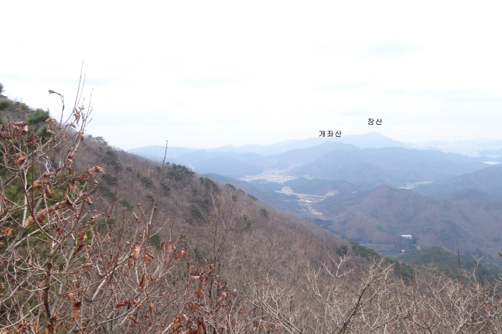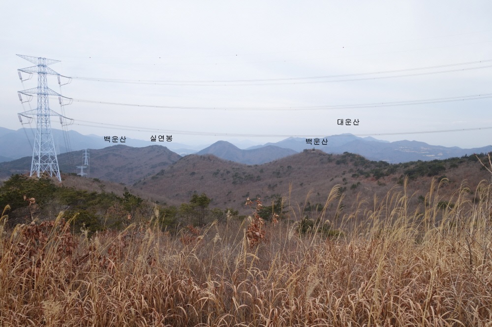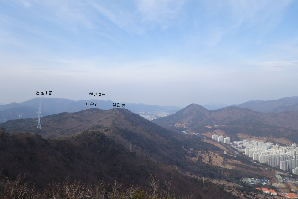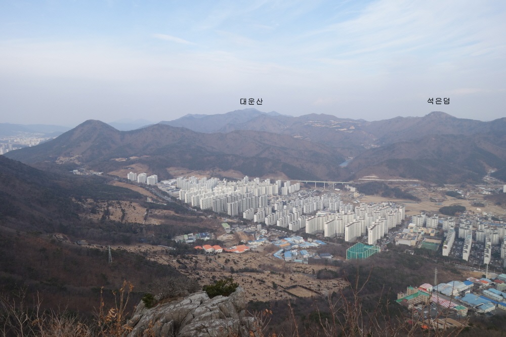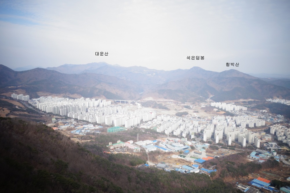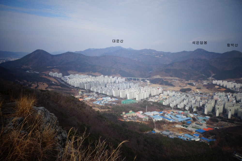 멀리는 대운산과 그 앞으로 석은덤봉 함박산 능선이 일자로 서 있다