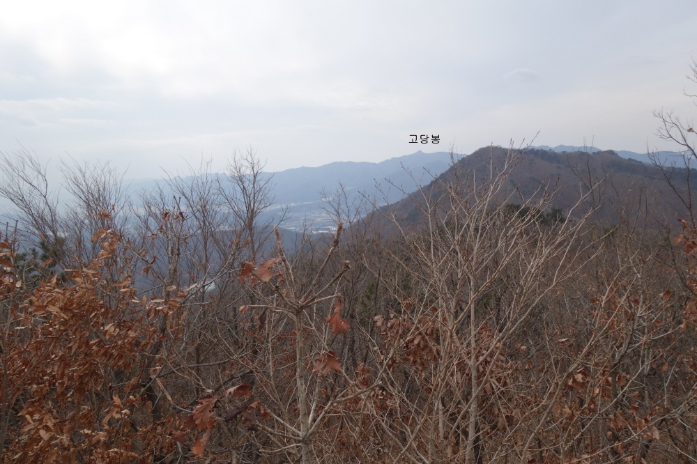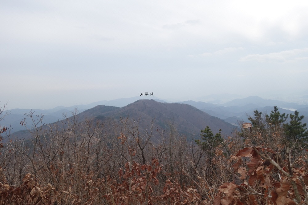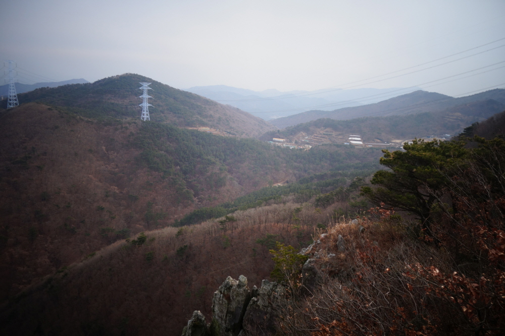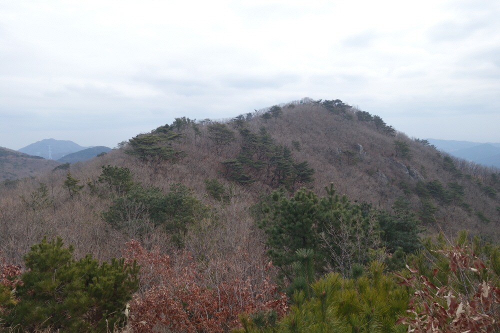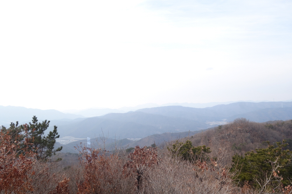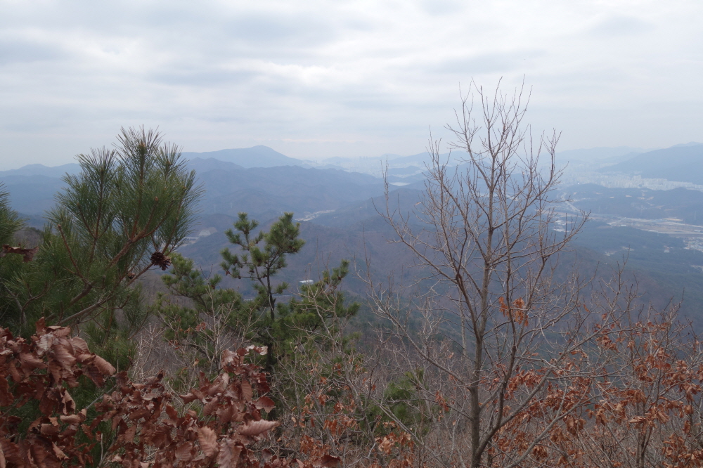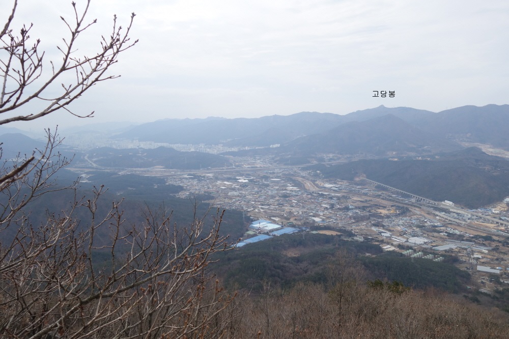 멀리는 대운산과 그 앞으로 석은덤봉 함박산 능선이 일자로 서 있다