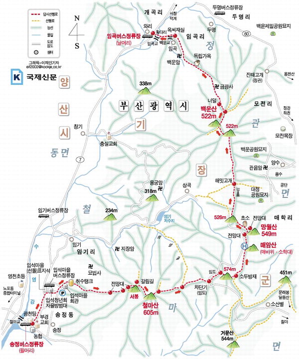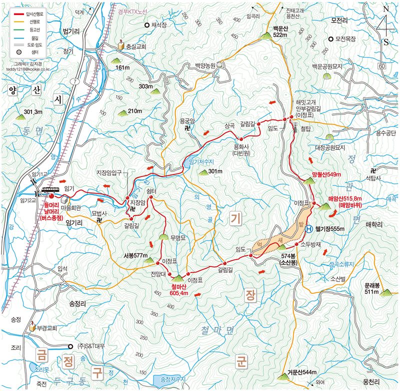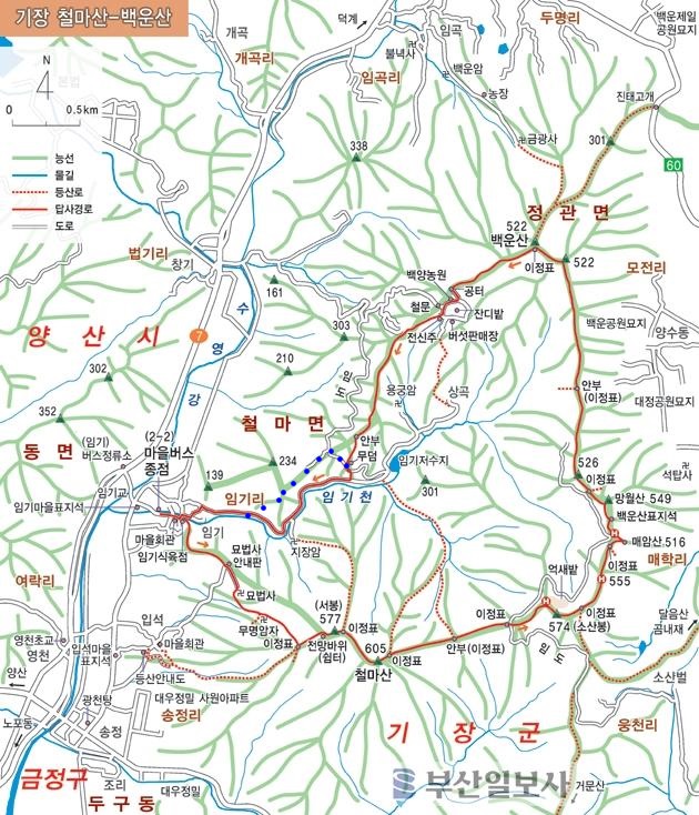 코스;임기마을회관/묘법사/법성암/입석마을길 합류/전망바위/철마서봉(이정표)/철마산 정상/임기마을 갈림길/임기마을 갈림길/안부(임기마을 갈림길)/임도(정자)/당나귀봉(소산봉)/이정표(중리갈림길,거문산,달음산 갈림길)/헬기장/매암산(매암바위)/망월산(산불감시초소)/임도/해밋고개(쉼터)/간이화장실/실연봉(522봉)/이정표(백운산 정상)/임도삼거리(쉼터)/백양농원/산길/임도/임도삼거리/묘지/임기마을회관