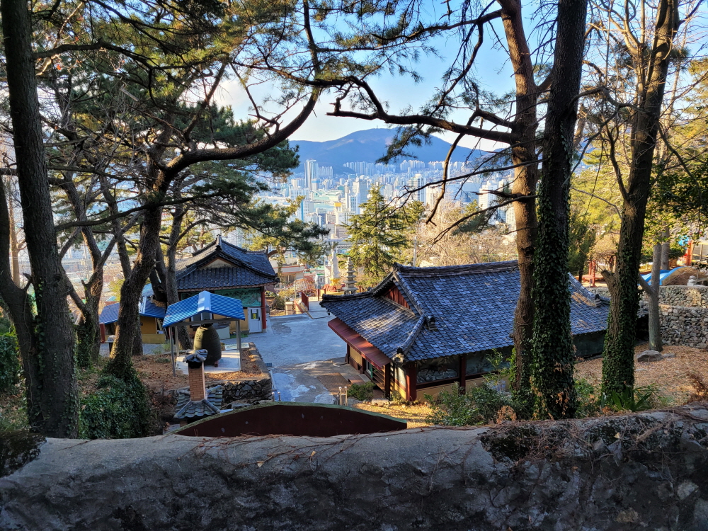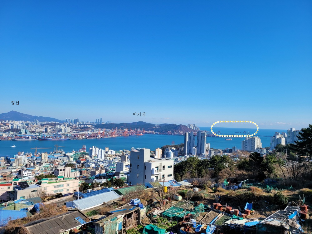멀리 해운대 장산과 해운대센텀의 고층아파트들이 보인다