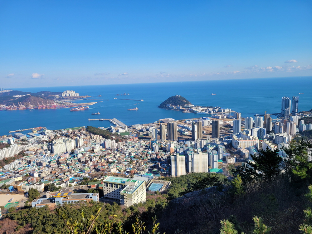 손봉 정상에서 바라본 해양대학교가 있는 아치섬과 오츅도 이기대 신선대의 모습