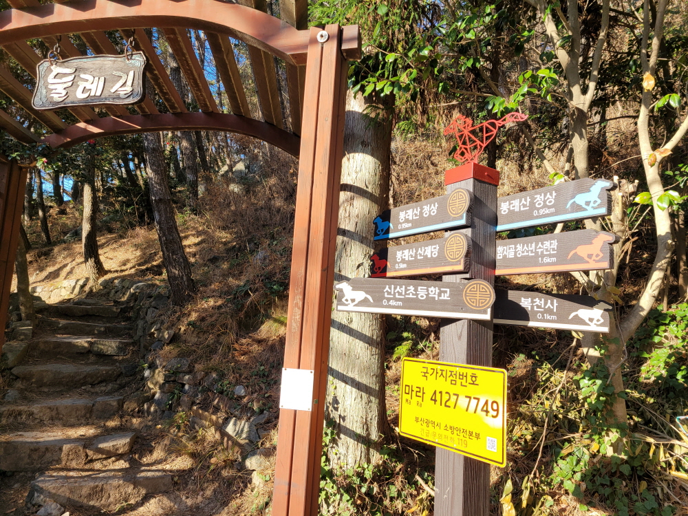 코스:대법사/유림아파트뒤/해돋이 벽화마을/해련사입구/고신대갈림길/임도갈림길/반도보라갈림길/손봉/자봉/봉래산/복천사 약수터/복천사/산제당/대법사