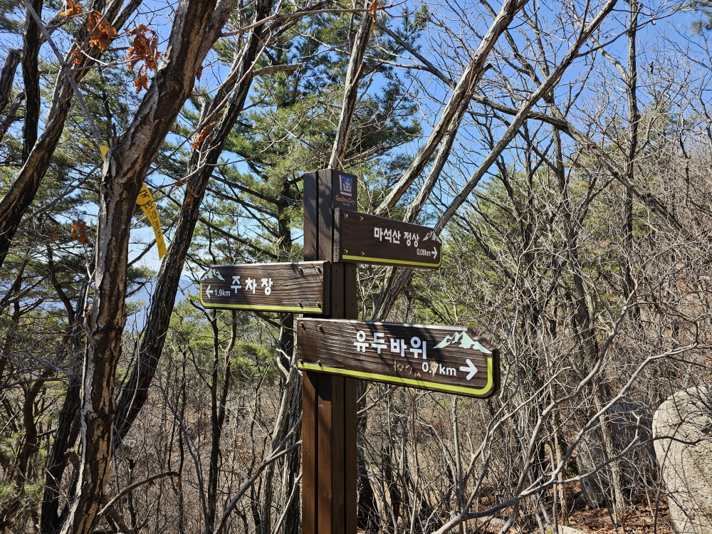 코스: 용문사 주차장/석문/용문사/마석산 정상/대포바위 갈림길/유두바위.대포바위/대포바위 갈림길/가시개바위 갈림길/가시개바위/가시개바위 갈림길/전망바위/삼지창바위/석은제 주차장