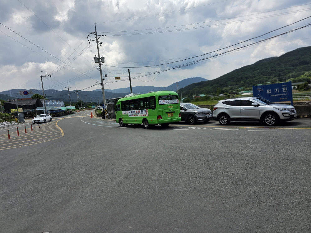 법기 수원지 부근 마을에 오니 전에 없이 주차장이 세 곳이나 있다.