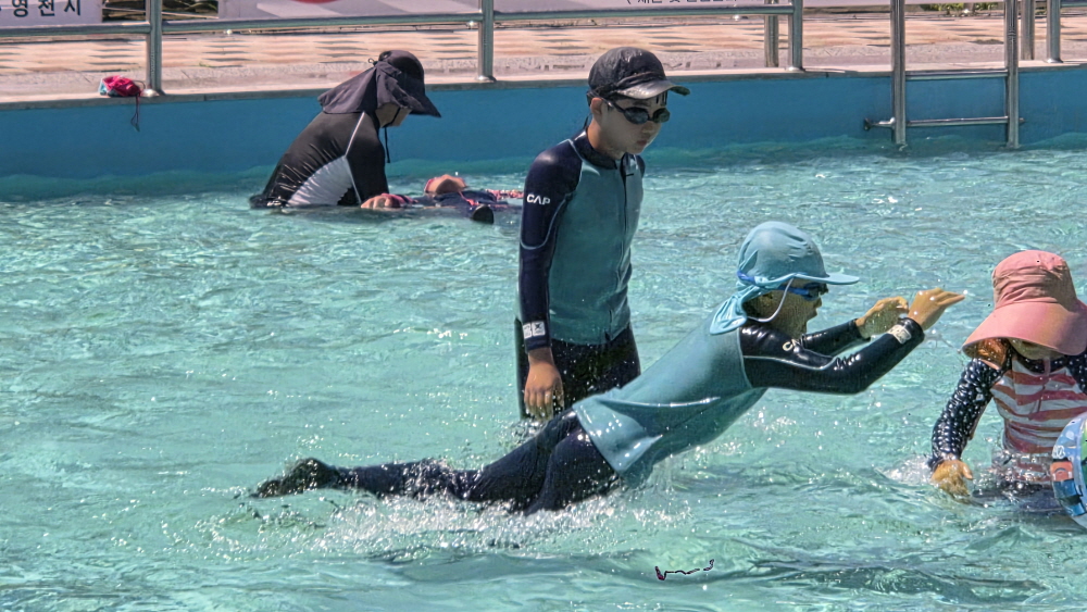 풀장의 물이 차가워서 오랫동안 놀지 못한다.