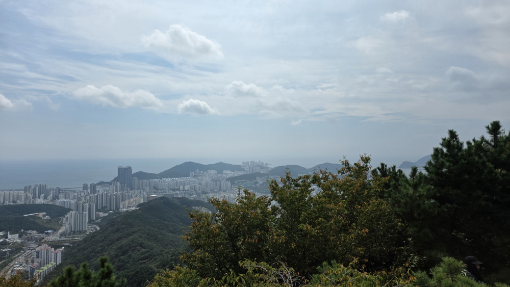 진행 방향 좌측으로 황령산과 금련산 그리고 금련산 뒤로 장산이 보인다