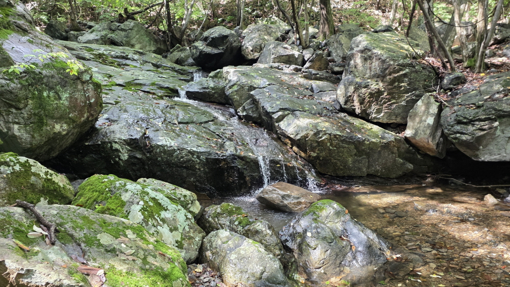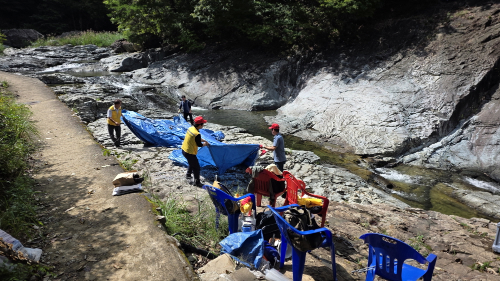 가뭄 때문에 계곡은 바짝 말라 있고 체육공원 위 예전 암반 지대는