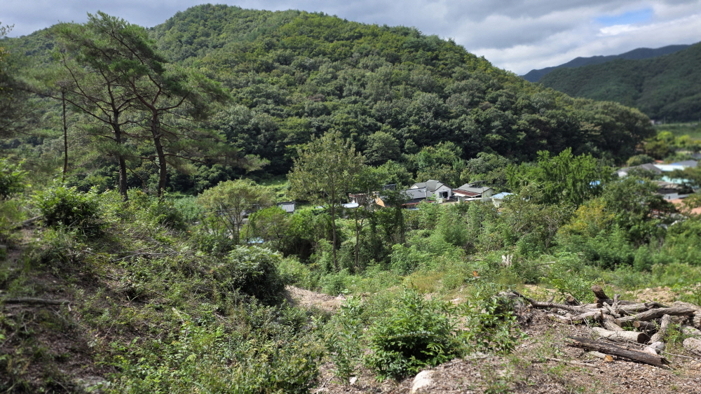 돌아보니 비구니 사찰인 운문사 앞의 지룡산이 보인다