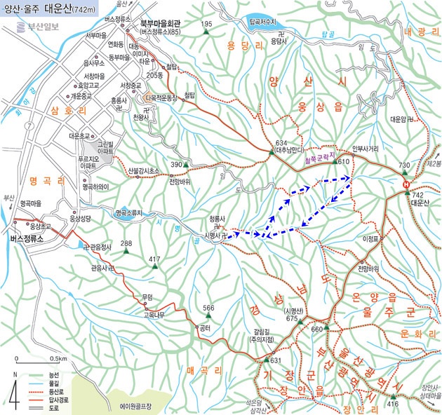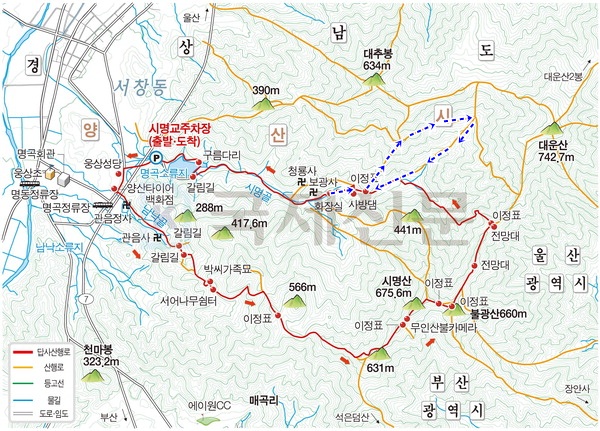 코스 : 시명사/사방댐/이정표/계단 갈림길/대운산 아래/계곡/계곡 삼거리/이정표/사방댐/시명사