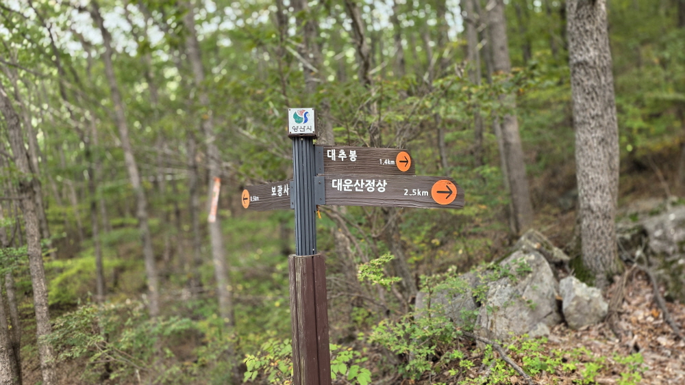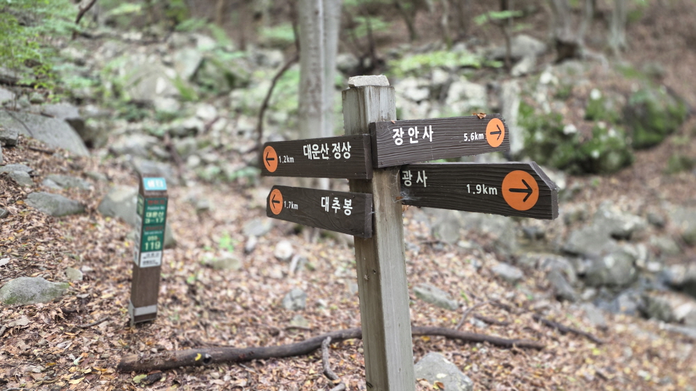 대운산 아래 1.2km 지점 갈림길이다