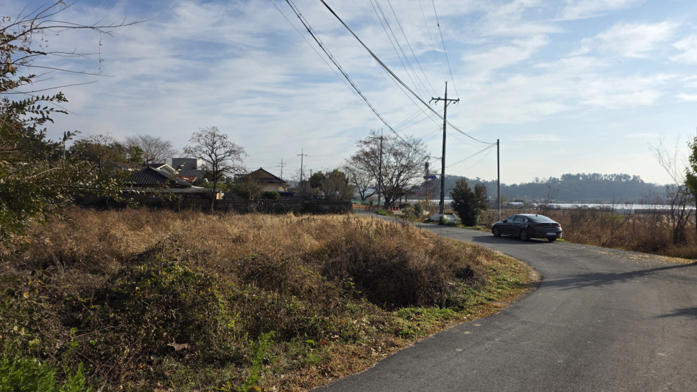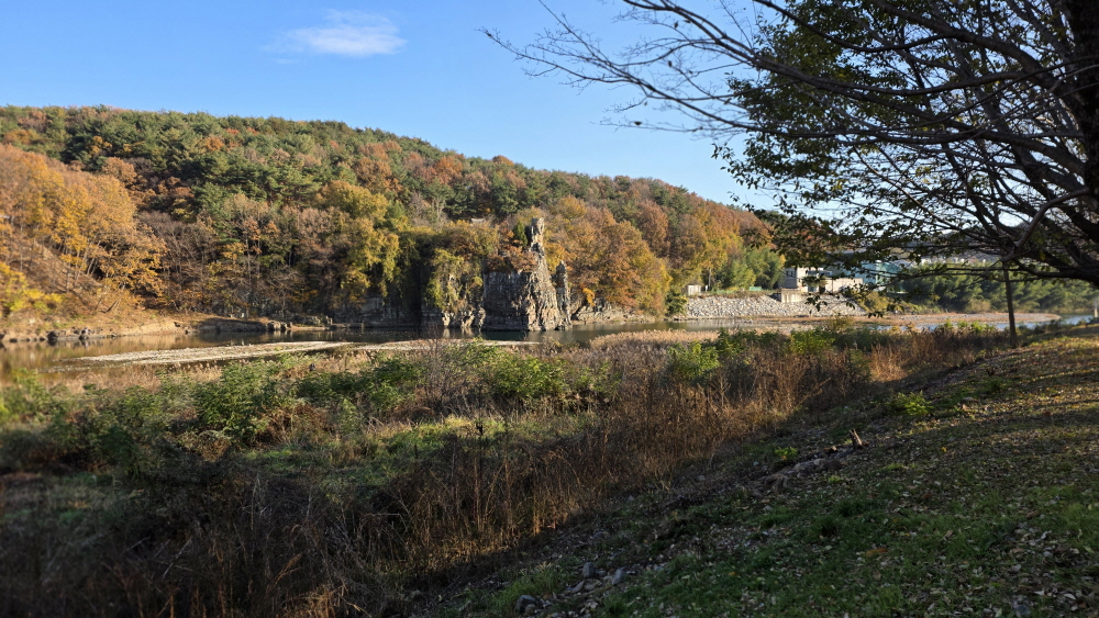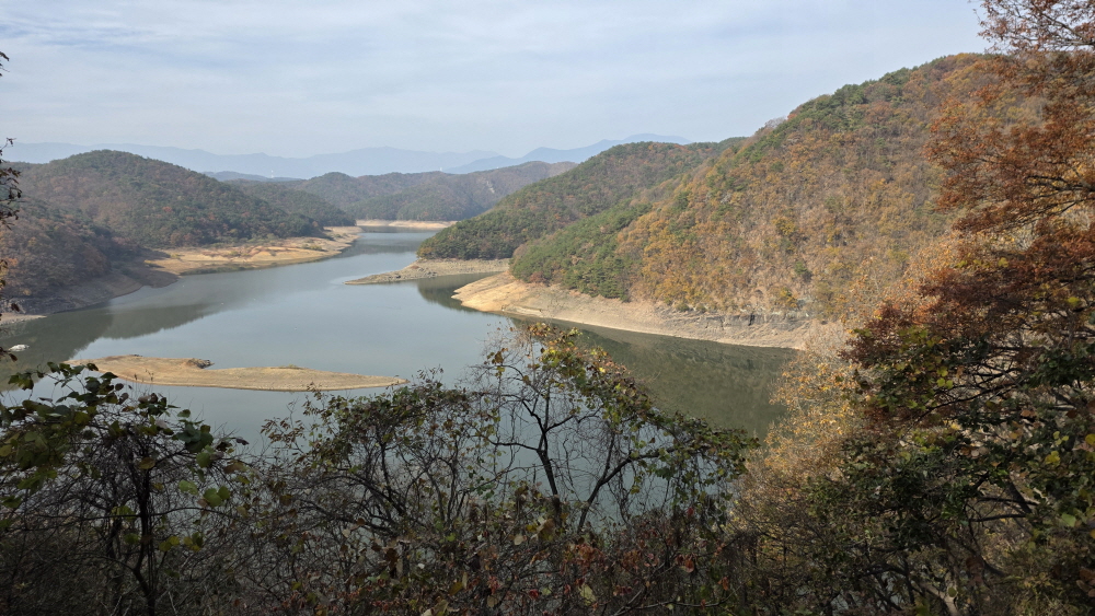 가을 가뭄이 심한 탓에 사연호의 수위가 많이 내려가 있는 것이 보인다.
