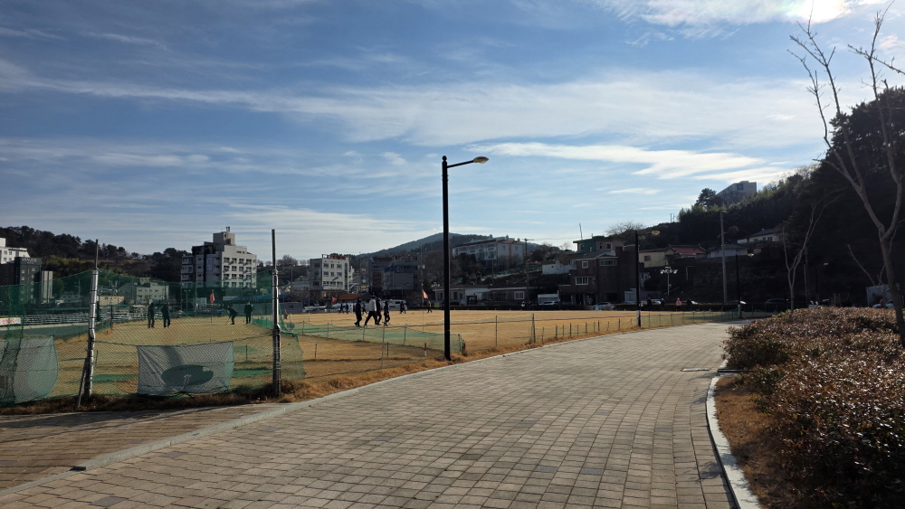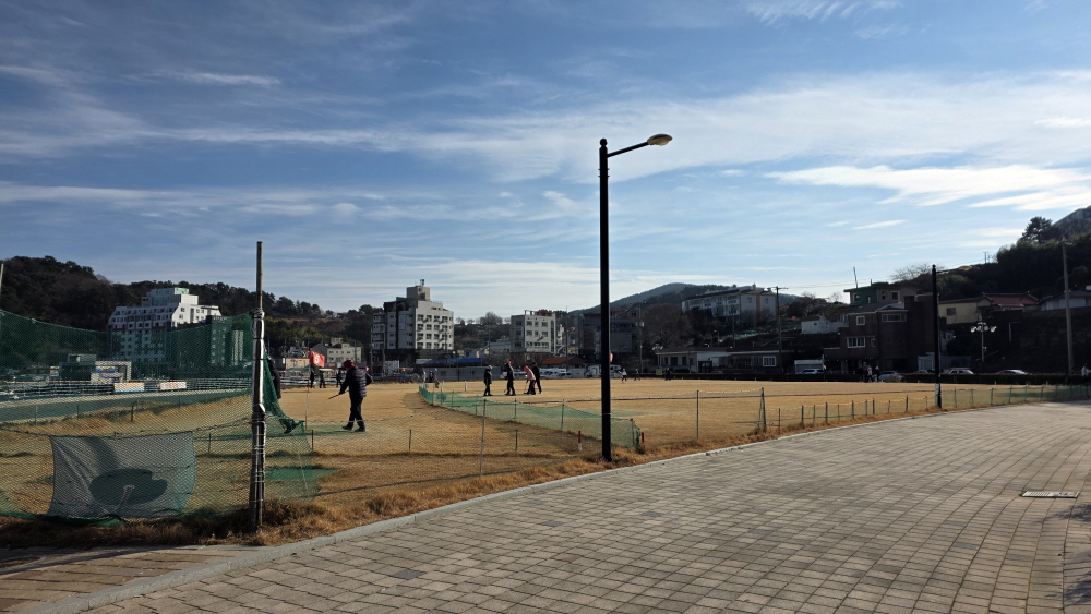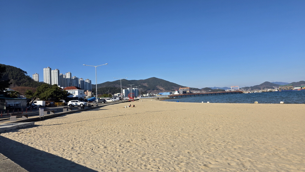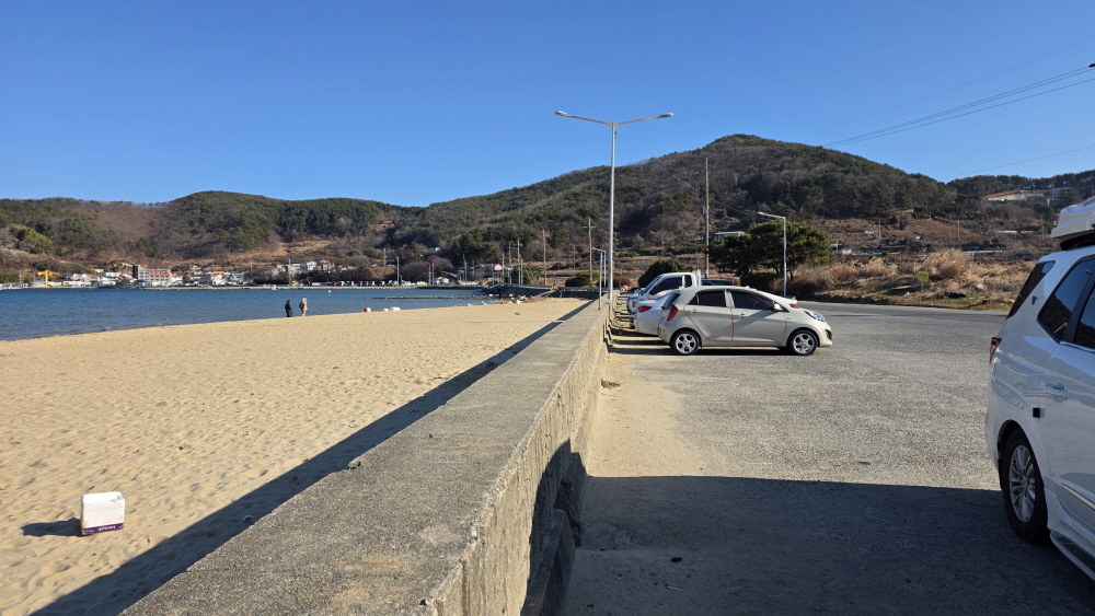 해변에 공원을 꾸며 놓고 게이트볼장이 있으며 도로변에 캠핑카들이 몇 대 있으나