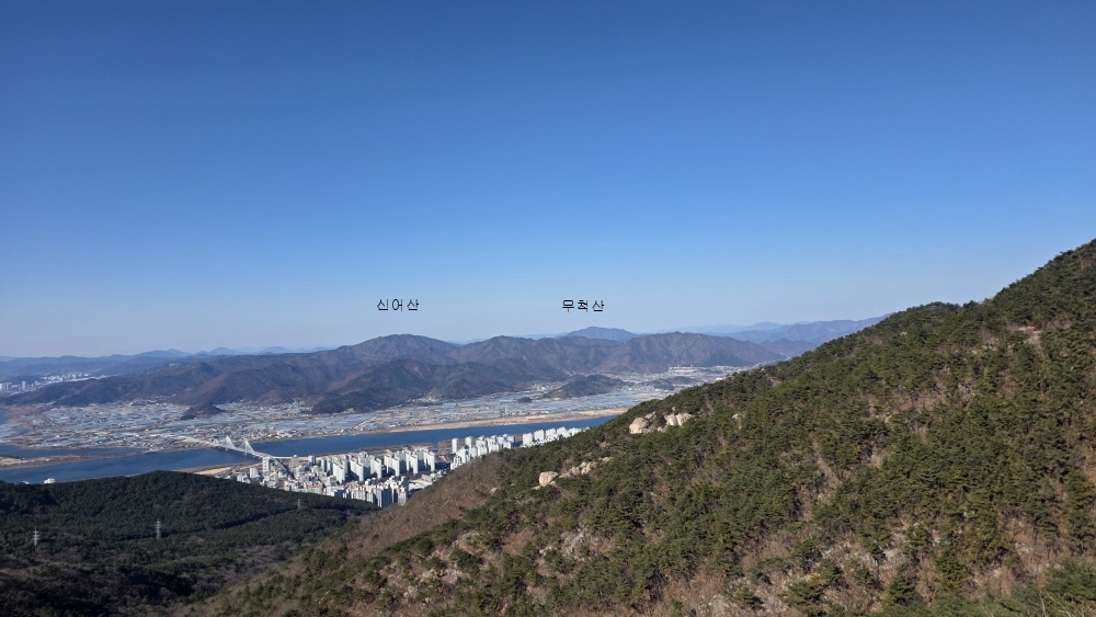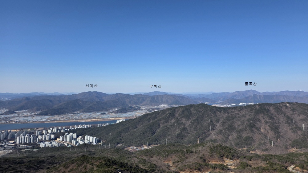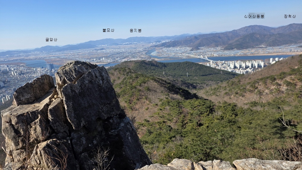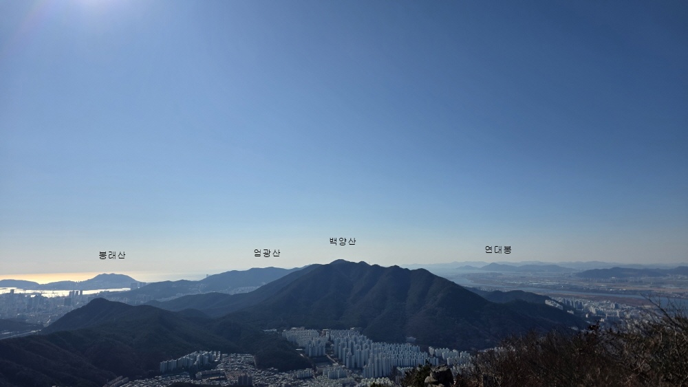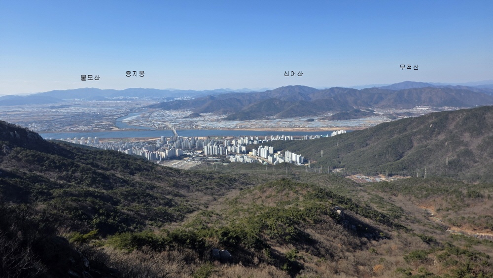 그 우측으로 김해 굴암산 창원 불모산 다시 김해 용지봉 가까이는 김해 신어산과 장척산 무척산