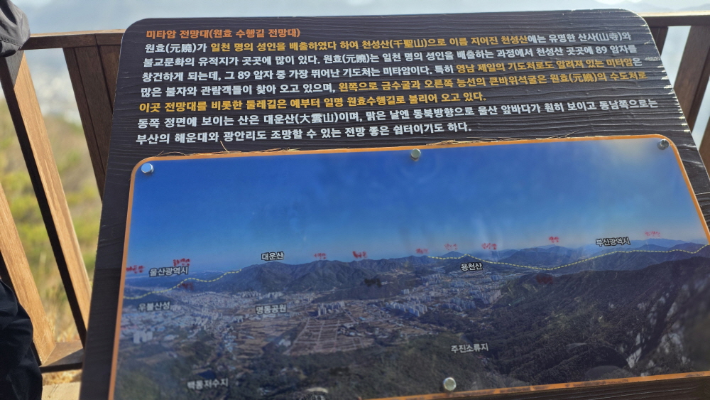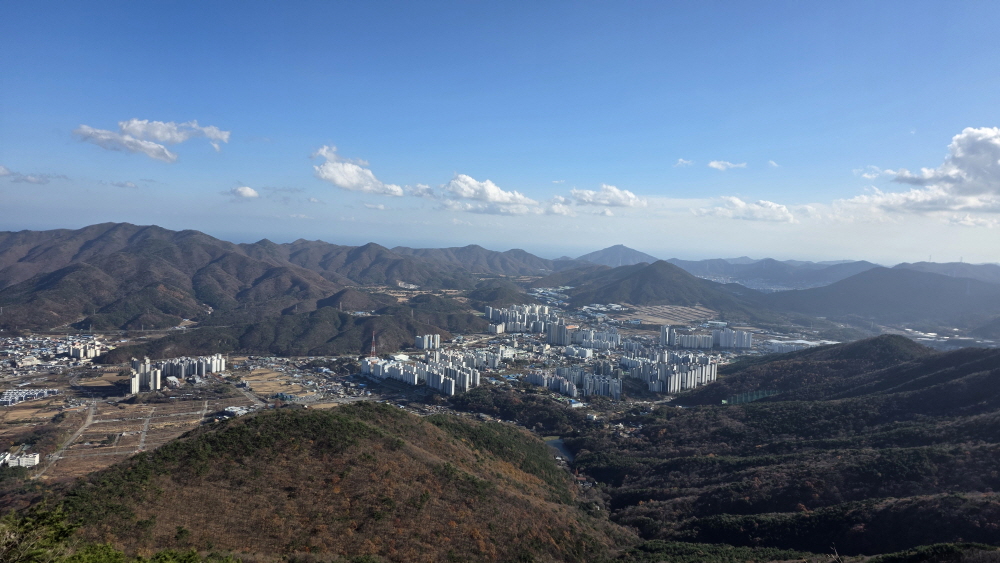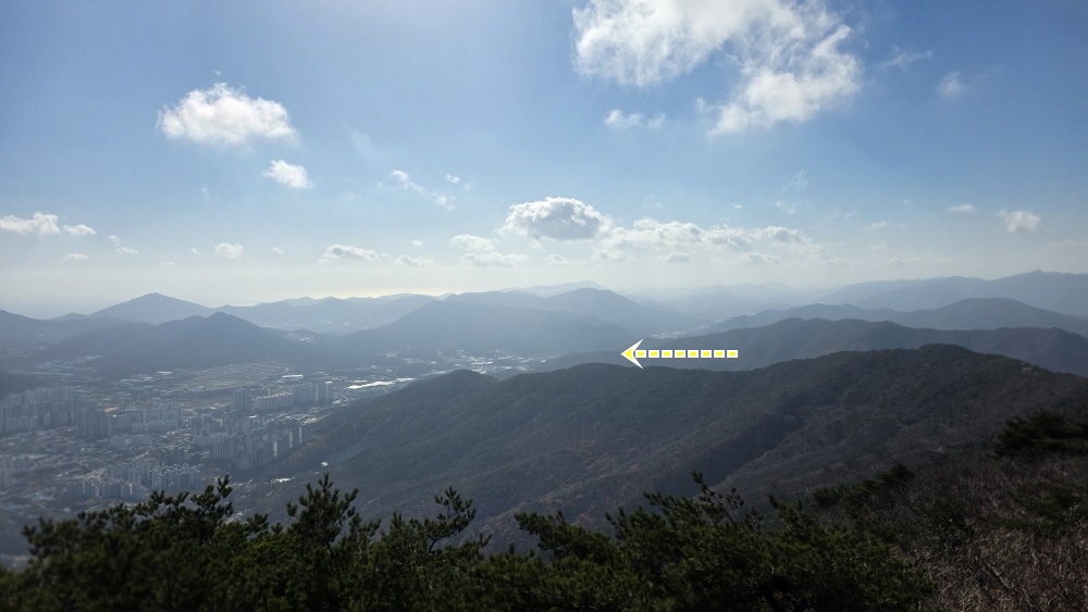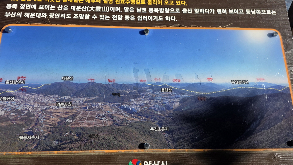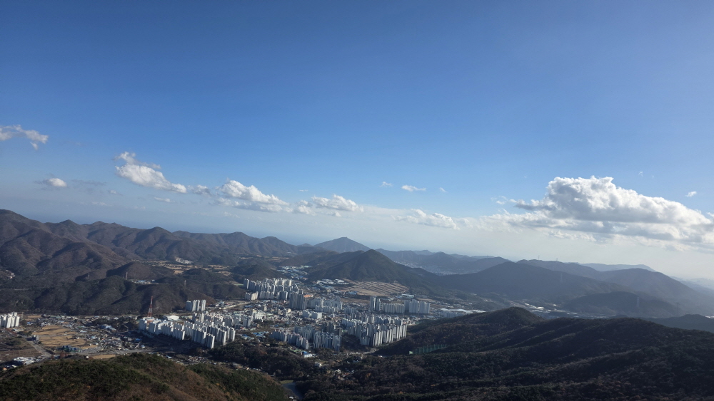 좌측부터 대운산 불광산 시명산 삼각산 전망대봉ㄷ 석은덤 함박산 달음산이 줄지어 서 있다