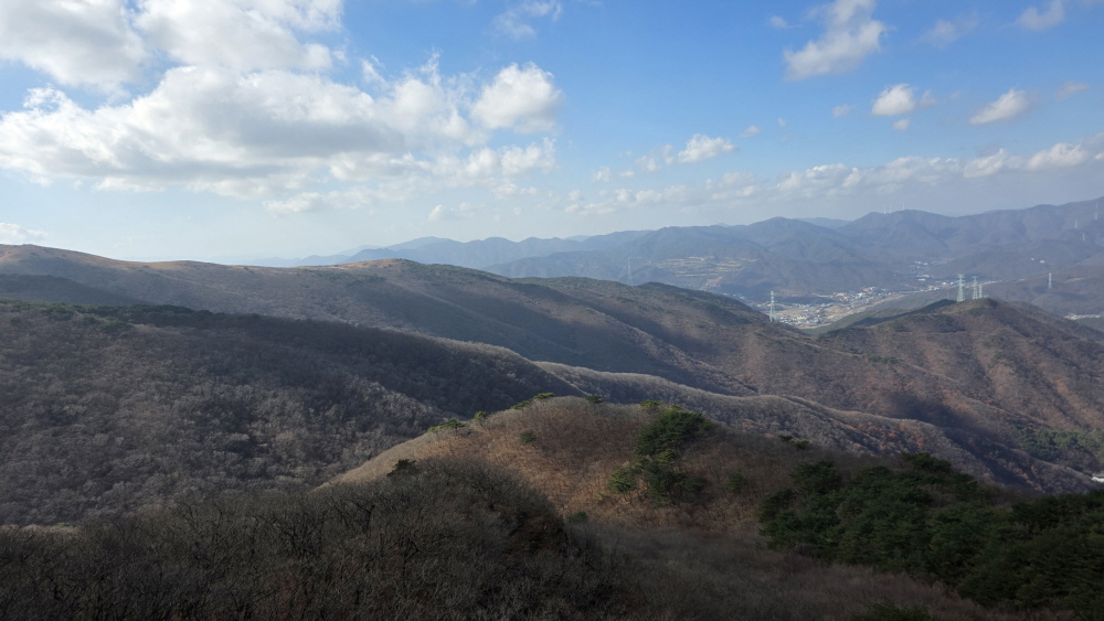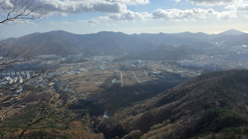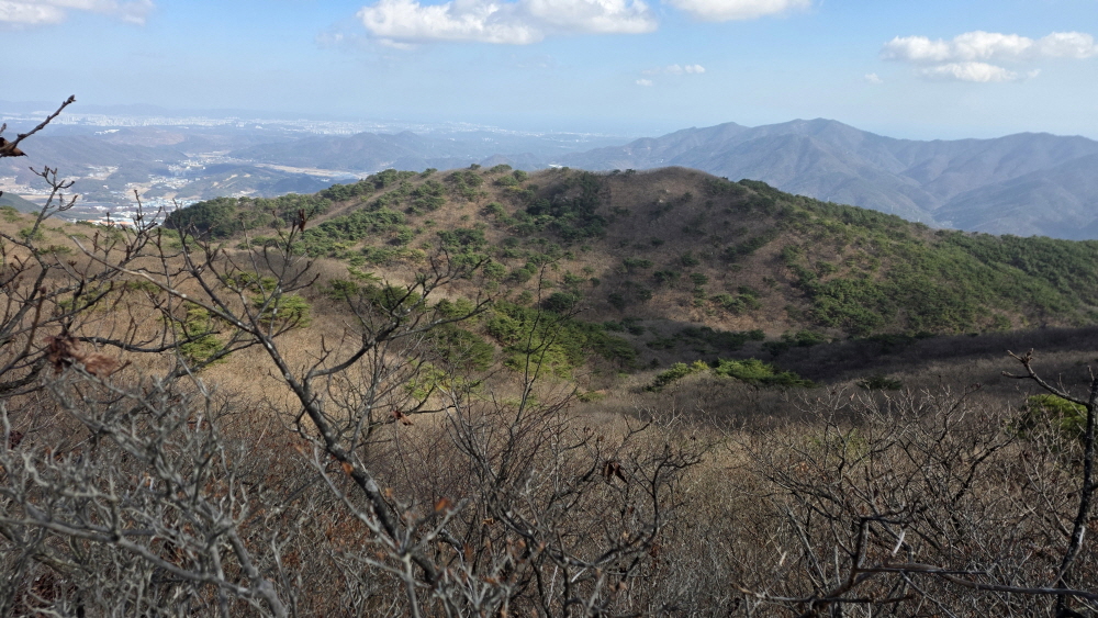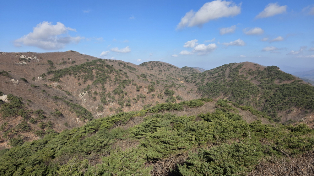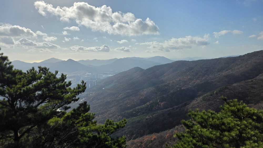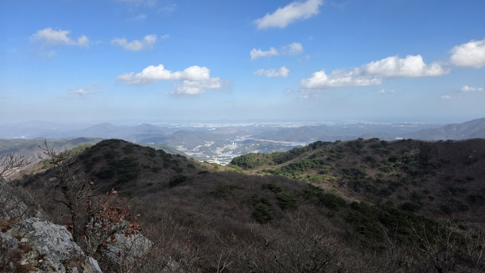 좌측부터 대운산 불광산 시명산 삼각산 전망대봉ㄷ 석은덤 함박산 달음산이 줄지어 서 있다