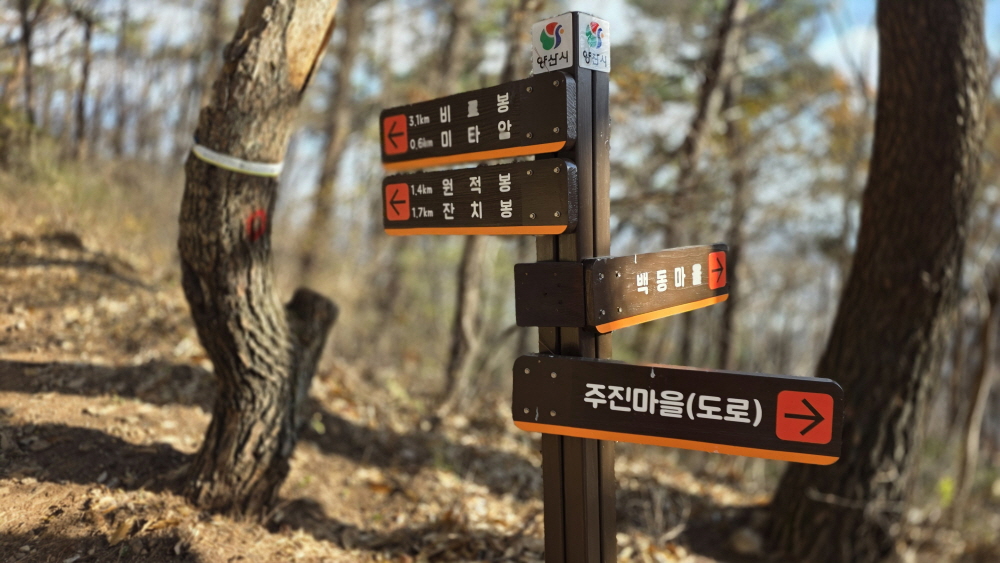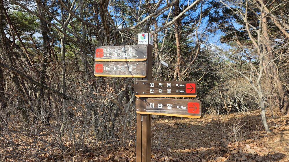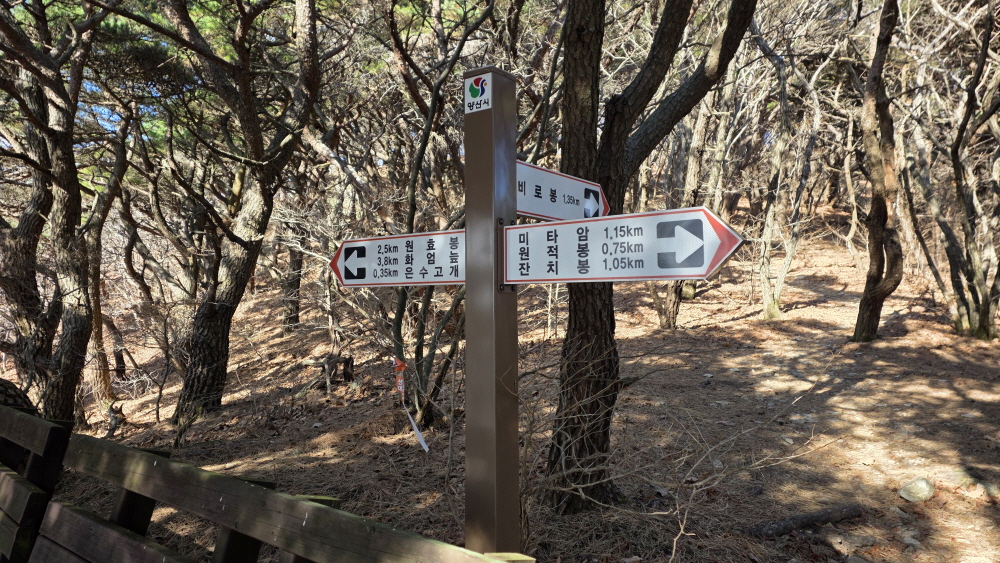 코스 : 미타암/미륵바위/원적봉 잔치봉 갈림길/원적봉/잔치봉/벤치 쉼터/임도(철쭉제단)/산길/원효봉 갈림길/원효봉 갈림길/원효봉 갈림길/바위전망대/천성산 비로봉 정상/임도/벤치 쉼터/원적봉 잔치봉 갈림길/미타암